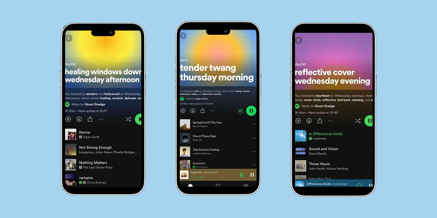 Spotify updates your “daylist” a few times day, generating what you’re likely to listen to around that time (or so Spotify says, anyway). Maybe you listen to something upbeat when you get ready in the morning, something more somber when you’re winding down for the night; whatever it is, Spotify’s algorithmically generated a daylist for it, dedicated to you, on a pretty much hourly basis.